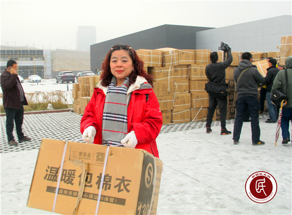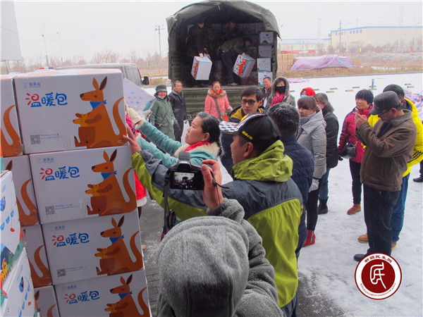 在温暖包集中等候的地点,乌鲁木齐退伍兵志愿者团队一下子来了20多名志愿者,站在寒风中等待军车的到来。装运温暖包的军车到达现场后,两名驾驶员也参与到堆放温暖包箱子的行动中。
