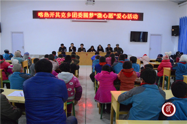 2017年1月4日下午,喀热开其克乡团委通过前期认真组织筹备,在县团委、乡党委的大力支持下,成功开展了圆梦“微心愿”爱心活动。本次活动主要进行了征集微心愿、整理微心愿、认领微心愿、圆梦微心愿等流程。在整个活动过程中,共收集“微心愿”300余份,通过梳理、核查、分析和汇总,然后根据轻重缓急、内容时限等,将收集的微心愿进行分类,然后建立“微心愿”墙,最后圆梦“微心愿”。本次圆梦“微心愿”活动主要由县团委、乡党委、乡团委、各村党支部、团支部认领微心愿,共计为110名困难家庭子女、“三好学生”、贫困学生等圆梦微心愿。发放的爱心物资包括书包47个,帽子、围巾、手套60套,棉衣2件,运动鞋1双,铅笔、铅笔刀、文具盒100套。