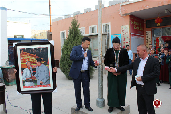 新疆民生网讯 (通讯员 文∕田丽 图∕艾合旦木·艾克拉木)4月3日,升国旗仪式结束后,阿孜汗村贫困户聋哑绣娘吾丽古丽·吐尔逊把她精心制作的十字绣新作——“毛泽东和库尔班·吐鲁木亲切握手”、黄金满地全景图等一一呈现在众人面前。