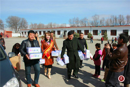 从乌鲁木齐专程赶赴塔城为边陲城市贫困孩子送达爱心包的军旅笑星、国家一级演员、新疆慈善大使高建新(中)与最美妈妈新疆区团队负责人傲蕾.玉清(左二)正在为受助学生搬运爱心物资。