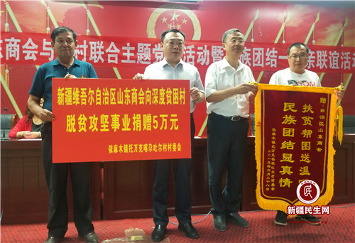 接下来,张保华会长代表山东商会全体会员企业,向托万克喀尕吐尔村捐赠5万元,用于支援深度贫困村脱贫攻坚事业,支持贫困群众发展生产、增收致富。接过村委会赠送的锦旗,张保华会长动情地说:“刚才走访了6户困难家庭,对于贫困群众的困难和问题,我感同身受,5万元对于托万克喀尕吐尔村脱贫攻坚事业来说也许是杯水车薪,但我们会持续关注托万克喀尕吐尔村脱贫攻坚工作进展,在项目开发、劳动力转移就业等方面一尽绵薄之力。”