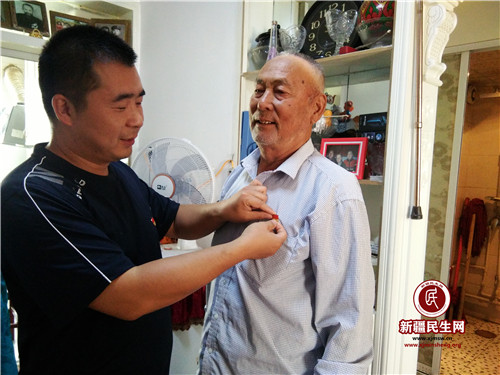 图3为:访惠聚干部为亲戚哈哈尔·热依木同志佩戴党徽
