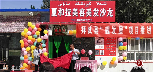新疆民生网(米热古丽·拜克热、李丹)2019年是打赢脱贫攻坚战拔寨的冲刺阶段。妇女既是脱贫攻坚的工作对象,也是脱贫攻坚的重要力量。为进一步推动贫困妇女实现居家就近就业脱贫致富的愿望,鼓励农村妇女从事美容美发等行业,带动帮扶更多的贫困妇女实现家门口就业,阿克苏地区扶贫办、妇联推动“靓发屋”等一系列妇女小微创业项目。5月14日下午,拜城县“靓发屋”项目推进会既揭牌仪式在康其乡阿热勒村举行,拜城县妇联党组书记、主席阿孜古丽·吐尼亚孜、康其乡党委副书记、乡长依买尔·阿布拉出席本次揭牌仪式。