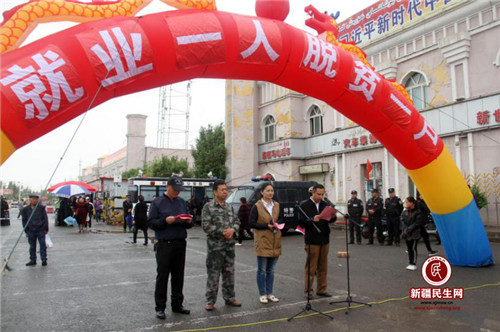 新疆民生网 为深入贯彻落实习近平新时代中国特色社会主义思想和党的十九大精神,牢牢聚焦新疆工作总目标,加大劳动力转移就业力度,更好的满足劳动力市场供需要求,促进农民增收致富,打好脱贫攻坚战,按照县委、县人民政府安排部署,5月26日由阿克陶县人社局主办,县商信局、扶贫办、总工会、残联、妇联共同参与的2019年“就业促脱贫”专场招聘会在县农贸市场(大巴扎)隆重举行。县人大常委会副主任尼加提.尤努斯出席活动并致辞,州人社局副调研员赵刚胜出席指导。