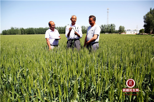 新疆民生网( 颜寿林)5月26日,温宿县农业技术人员在克孜勒镇吾仑克村小麦高产示范田里查看麦穗灌浆情况。今年以来,温宿县狠抓小麦追肥、灌水、防虫、除草等田管增产技术措施,促使全县22.4万亩小麦长势喜人,并提前进入了结穗灌浆期,为今年夏季小麦增产丰收打下了基础。