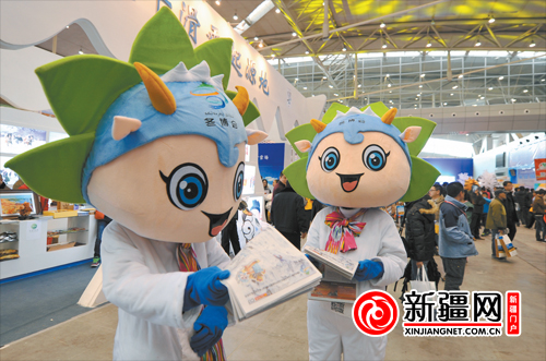 2014年11月28日,在中国西部冰雪旅游节暨第九届中国新疆冬季旅游产业交易博览会上,冬博会吉祥物“冬冬”走进展馆为冬博会增添喜庆气氛。(资料图片)
