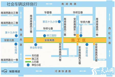 为保证施工的顺利进行及周边居民的基本出行,原经安居南路过境的车辆,可通过河滩快速路、南湖西路、南湖南路、西虹东路等外围道路绕行。施工道路沿线单位、居民的车辆,可通过华普巷、华祥五巷、华祥七巷、南湖南路西一巷等道路绕行。