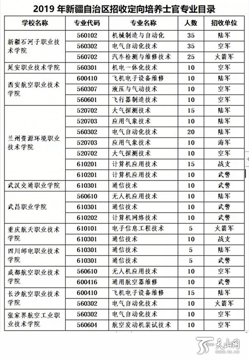 天山网讯(记者马蓓报道)为加快培养军队现代化建设需要的高素质士官人才,自治区2019年将依托地方11所普通高等学校开展定向培养士官工作,陆军、海军、空军、火箭军、战略支援部队和武警部队共计招收定向培养士官355人。