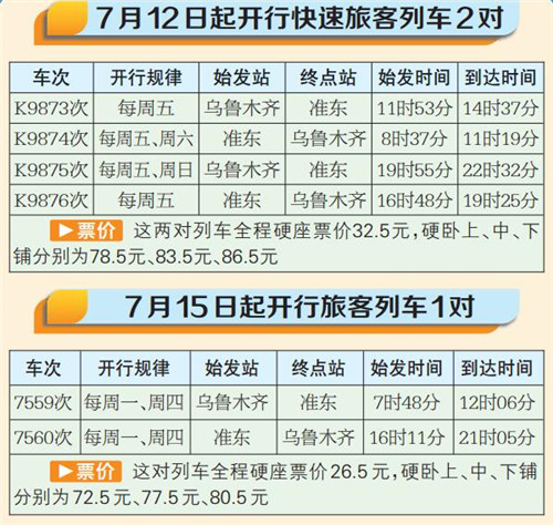其中,开行K9873/K9874、K9875/K9876次快速旅客列车2对。开行时间及规律为:7月12日起,每周五开行乌鲁木齐至准东K9873次;每周五、周六开行准东至乌鲁木齐K9874次;每周五、周日开行乌鲁木齐至准东K9875次;每周五开行准东至乌鲁木齐K9876次。