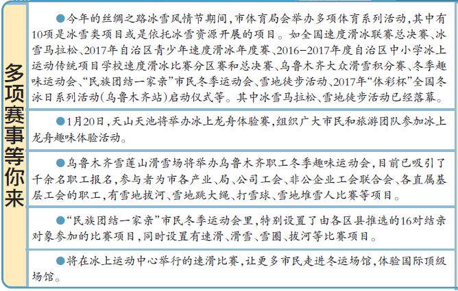 新疆网讯(记者牟敏 盖煜)已于6日开幕的第十四届乌鲁木齐丝绸之路冰雪风情节将持续至今年3月,在此期间,首府也将开展多项文化体育活动,吸引市民参与。