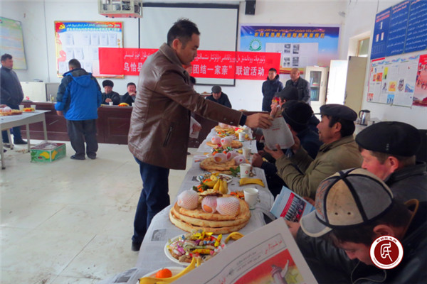 在欢快的气氛中,医院书记周论·买买提卡热、副院长丁志刚、访惠聚工作组、驻村干部与结对认亲户一起,叙团结、话友情,祝福祖国、祝福新疆、祝福各族人民。