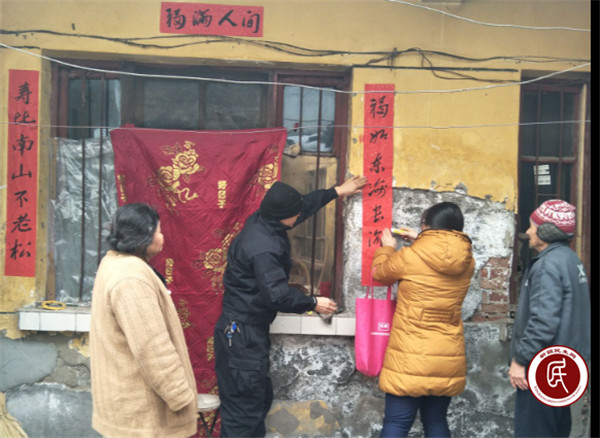 图为春节前夕仓盛社区工作队队员与社区干部一起利用入户时间上门为居民送对联