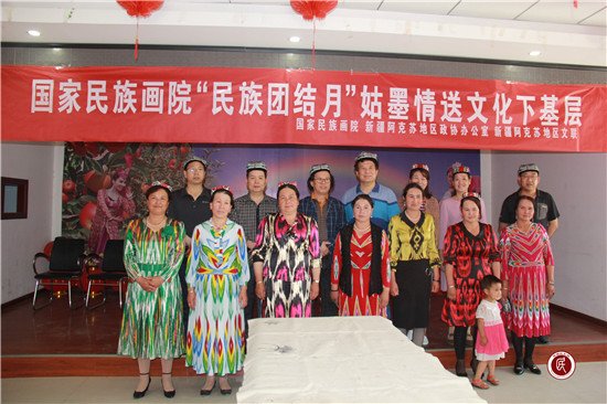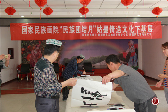 此次活动,由阿克苏地区政协牵头,著名画家、国家一级美术师胡宝利,中国美术家协会会员何二民、包少茂、孟鸣现场挥毫泼墨,创作了“民族团结一家亲、和谐发展一条心”“各民族同呼吸、共命运、心连心”等30余幅书法作品及20余幅秀丽的江南景致、灵动的花鸟图送给基层干部群众