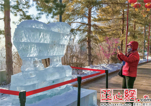 走进红山公园东门,通往山顶平台的步道上方,大红灯笼很是喜庆。在双鹿迎宾广场,萌萌的卡通冰雕吸引了不少游客驻足,大家纷纷拿出手机拍照。冰雕师傅孙广鸿正拿着小铲对一座冰雕进行最后的雕琢。1月16日,这些冰雕将全部完工。