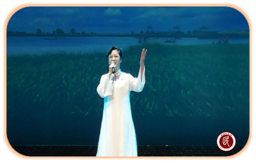 图为鹤壁朗诵艺术家李锋女士在诗歌春晚现场朗诵《鹤鸣湖》