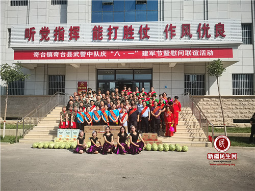新疆民生网(王玮月、武开欣、张艳茹)7月26日上午,奇台镇城隍庙社区、马王庙社区、水磨河社区、红十字广联爱心联盟在奇台镇统一组织下,赴驻县武警中队慰问武警官兵,为他们送上两部空调和西瓜、避暑饮料等慰问品,并向他们致以节日的问候。
