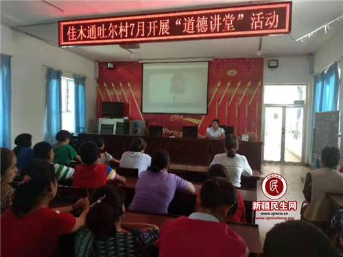 新疆民生网(支小玲) 7月22日,为积极培育和践行社会主义核心价值观,通吐尔村组织全体村民、返乡学生开展道德讲堂活动,活动主要内容有唱歌曲、学模范、诵经典、谈感悟、送祝福五个环节。