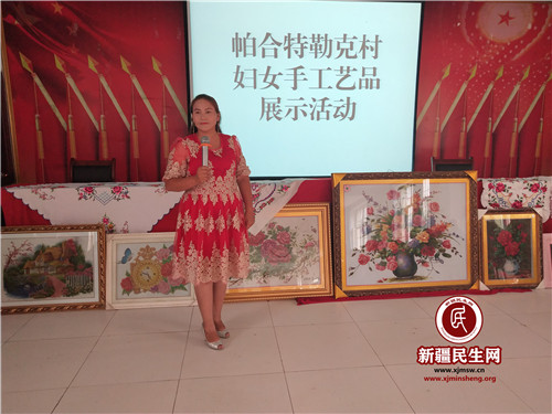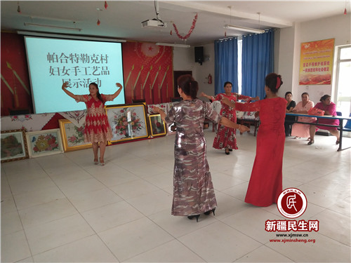 新疆民生网(梁佳妮) 7月29日,阿克苏市托普鲁克乡帕合特勒克村大礼堂里,妇女穿着美丽的艾德莱斯,跳着优美的舞姿,唱着动听的歌声,走着自信的模特步,将自己得意的手工艺品带到村委会进行展示交流。