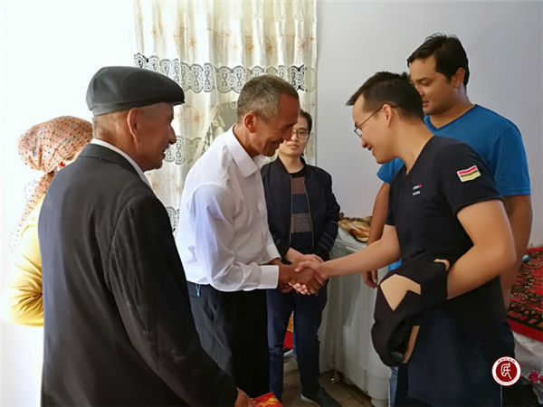 援疆医疗专家袁建靖(左一)前往慰问结对亲戚艾山·卡热木(左二),送去节日的祝福